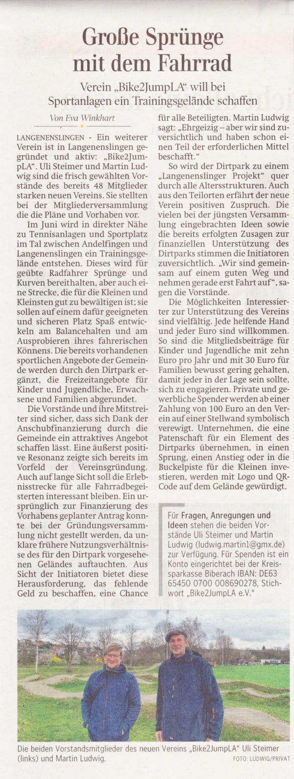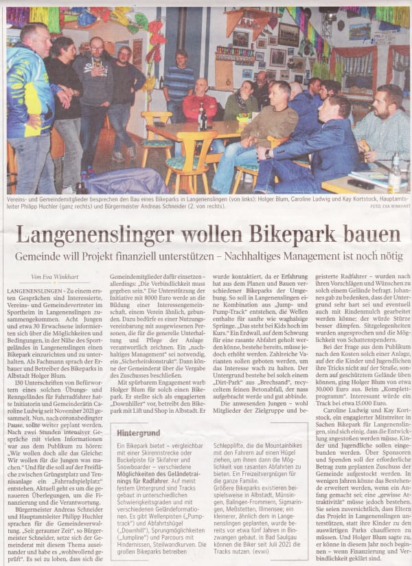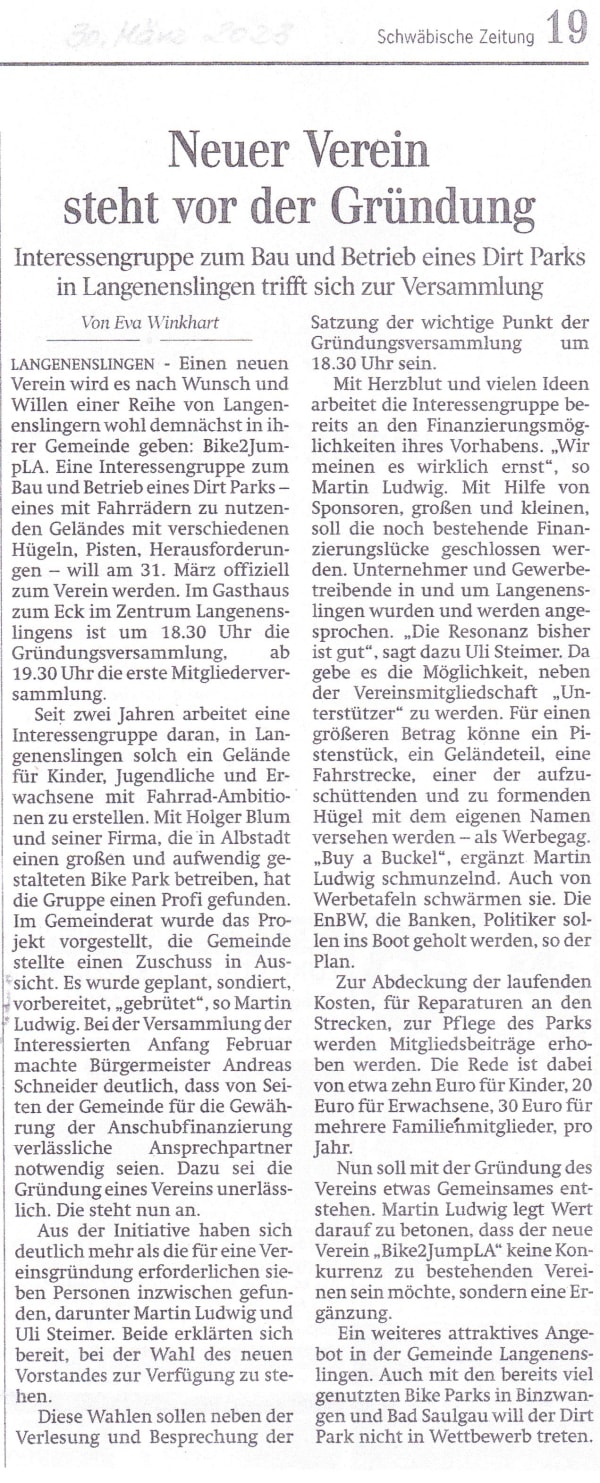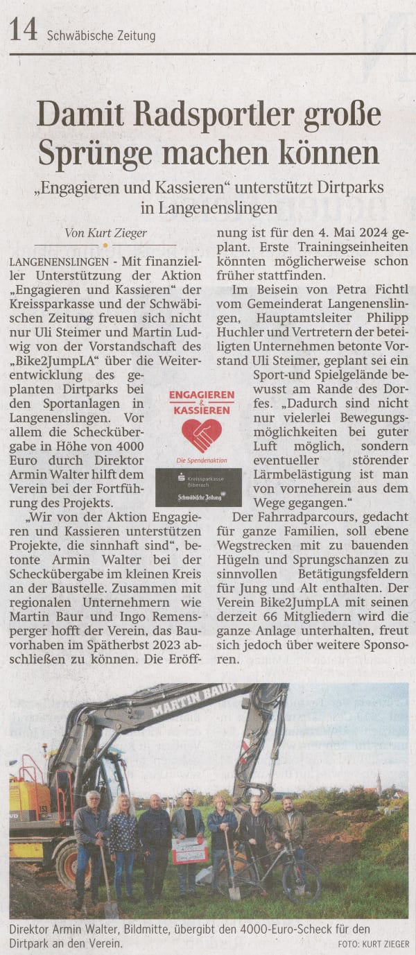 Unser Dirtpark bewegt nicht nur die Biker, sondern auch die Region! Vom ersten Spatenstich bis zu den ersten fetten Sprüngen – hier findest du eine Sammlung der Medienberichte rund um unser Projekt in Langenenslingen. Stöbere durch die aktuellen Zeitungsartikel und Berichte, um mehr über die Entstehung und die Highlights von Bike2JumpLA zu erfahren.